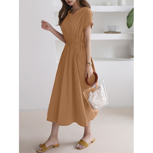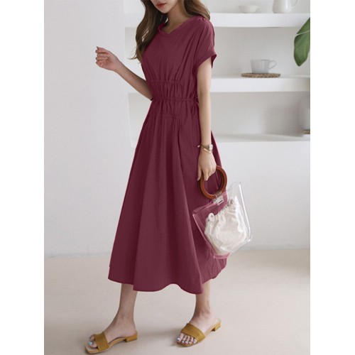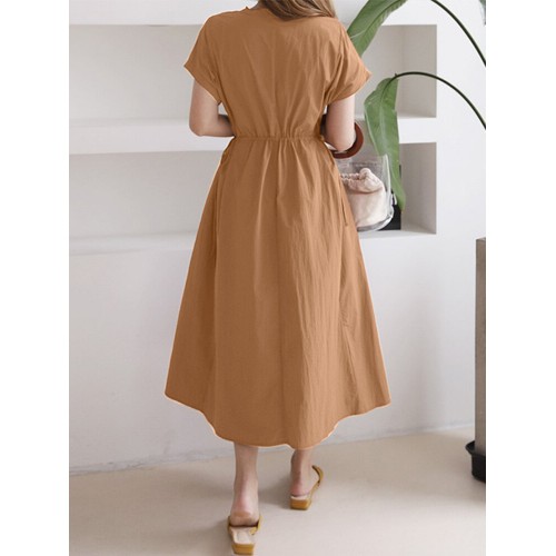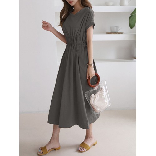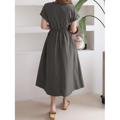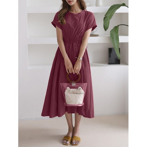Solid Drawstring Short Sleeve Round Neck Casual Midi Dress