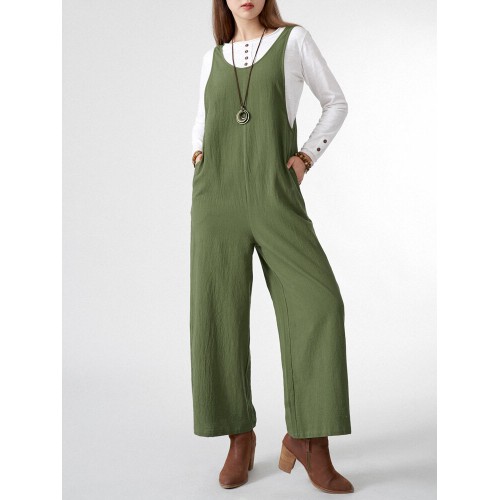 Solid Pocket Open Back Sleeveless Straight Leg Jumpsuit