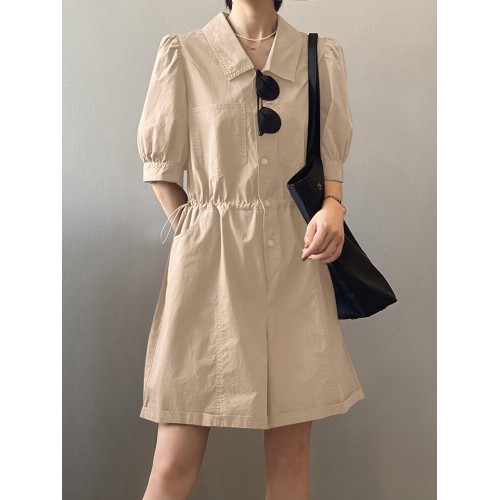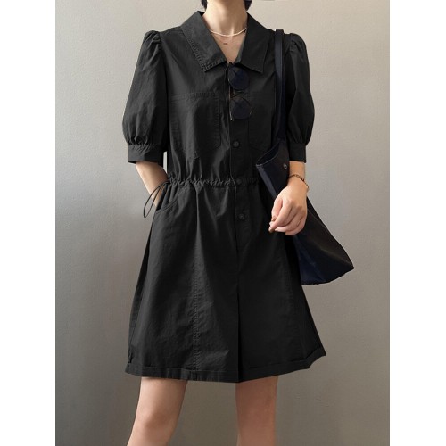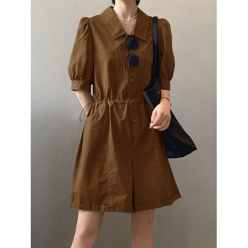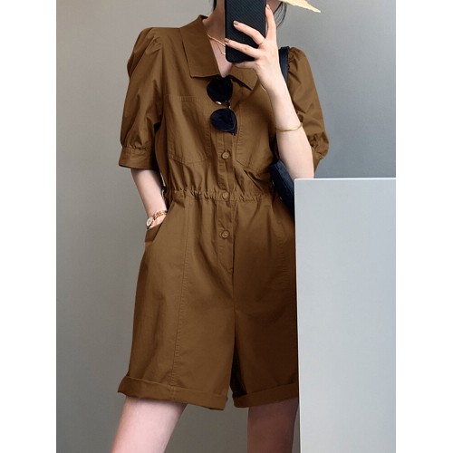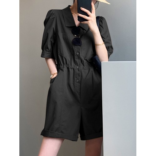 Solid Button Pocket Elastic Waist Lapel Short Sleeve Casual Romper