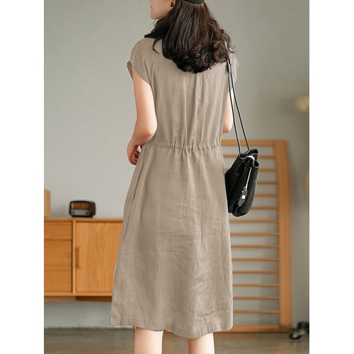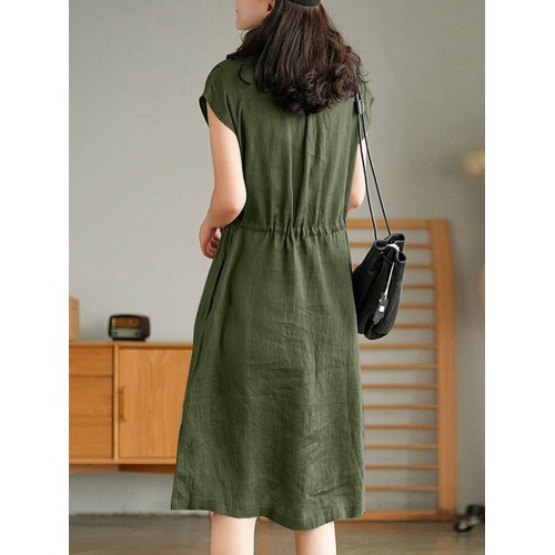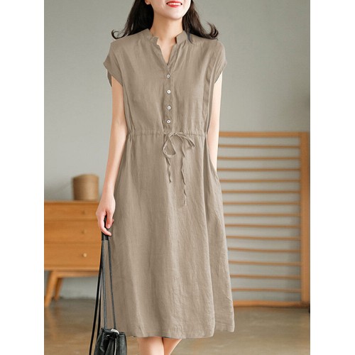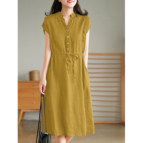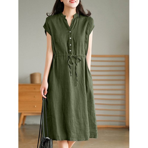 Solid Pocket Drawstring Waist Button V neck Short Sleeve Dress