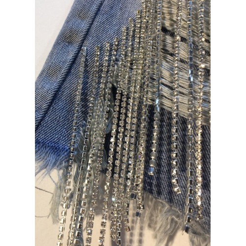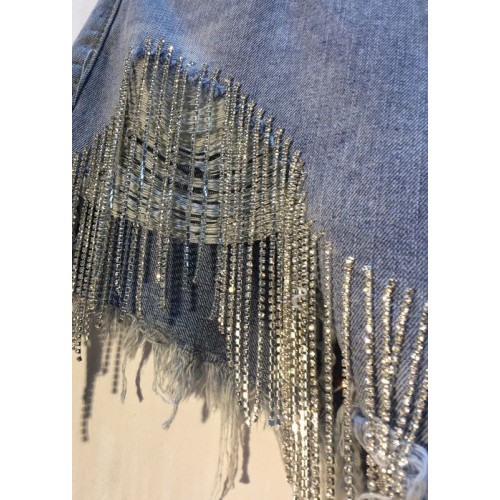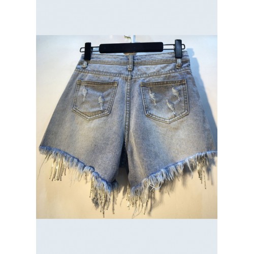 Slim Fit Blue Asymmetrical Design Tassel Diamond Cotton Denim Shorts